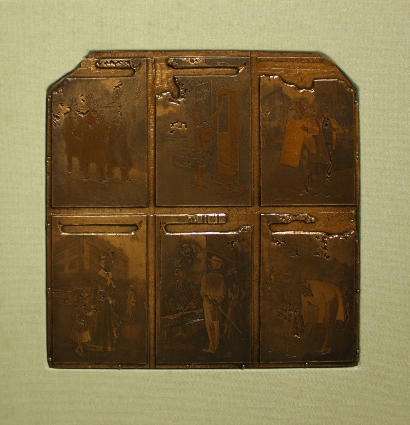 - une plaque de cuivre ayant servi à l’impression en photogravure de chromos Poulain de la série nommée « les acteurs ».