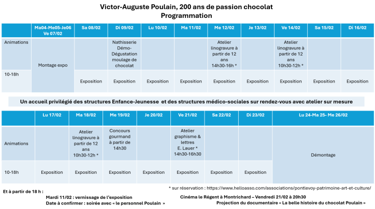 Une trentaine d’affiches de collection des années 1890 – 1920, vantant les mérites du chocolat, ont été présentées aux visiteurs du 18 juillet au 02 août 2020, permettant de redécouvrir les grands noms d’illustrateurs de cette époque. Un carnet d’activité agrémentait la visite. De plus, une conférence a été donnée par Pierre Cappiello, petit-fils de l’affichiste très renommé à l’origine du logo de la marque Poulain.