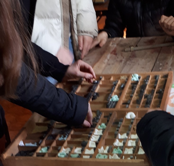 mars 2024 : accueil d’une classe de 4ème du collège de Montrichard dans le cadre d’un projet avec leur professeur de Français. Après un bref historique de l’imprimerie, découverte de la typographie.
